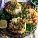 Thick roasted cabbage steaks brushed with a sweet and tangy maple mustard glaze, finished with a crunchy pecan breadcrumb topping. Crispy on the edges and tender in the center, this plant-based dish works beautifully as a holiday side or satisfying main over quinoa.