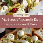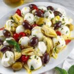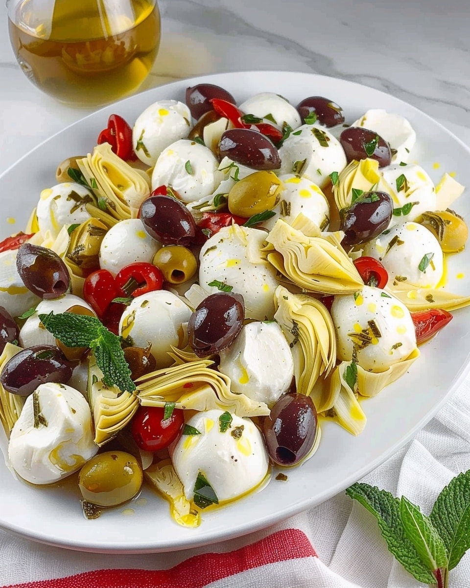 A quick and flavorful no-cook Mediterranean appetizer made with mozzarella balls, marinated artichokes, and olives tossed in a fragrant herb and citrus dressing.