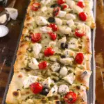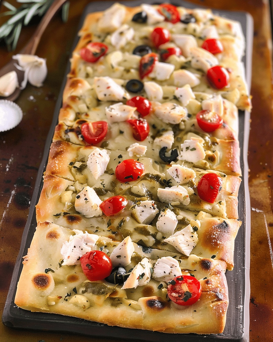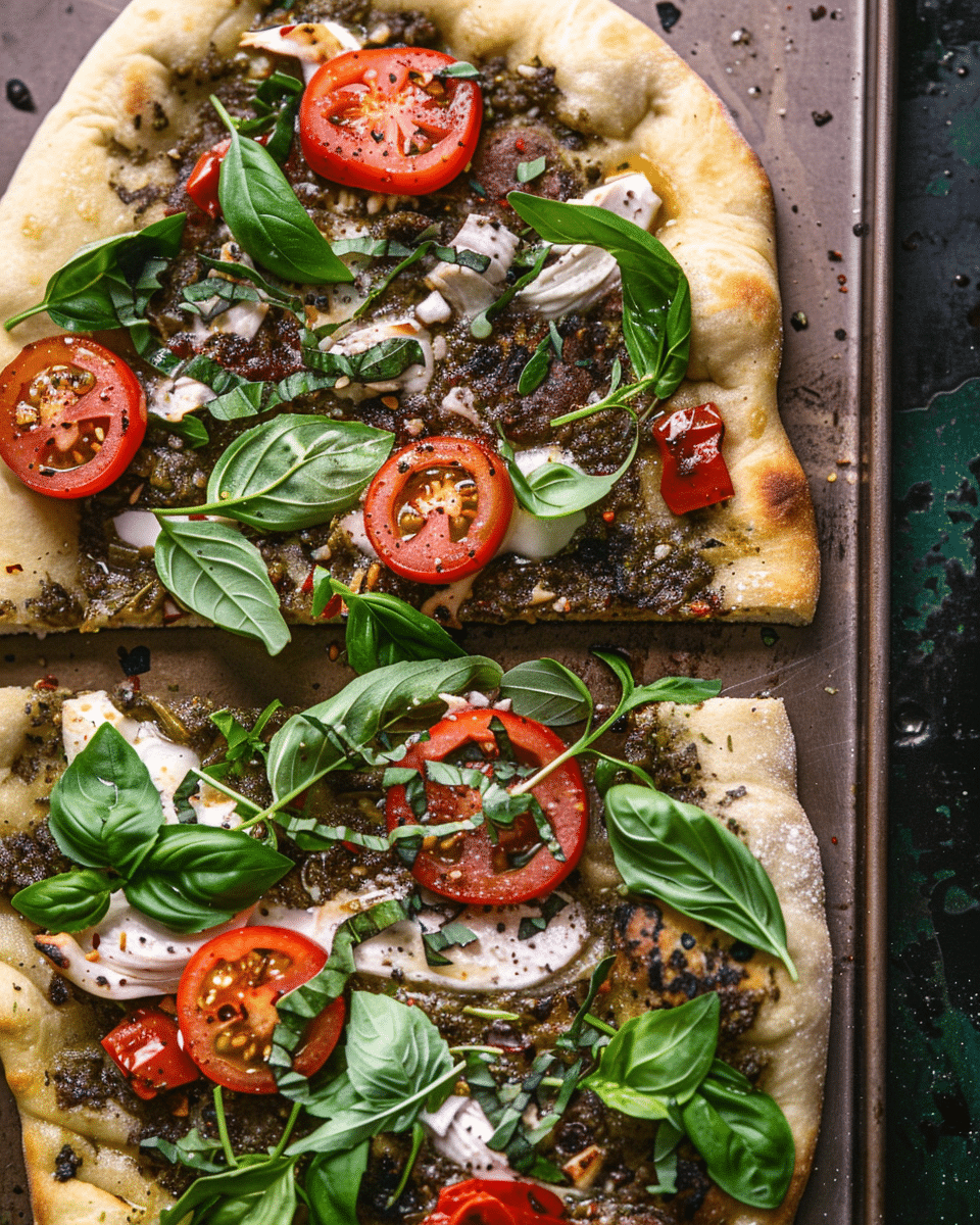 A quick and flavorful Mediterranean-inspired flatbread topped with pesto, shredded chicken, fresh veggies, feta, and mozzarella cheese. Baked until crisp and melty, it’s a perfect 20-minute meal for busy weeknights or casual entertaining.
