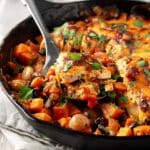 Mexican Chicken and Sweet Potato Skillet is a bold, colorful one-pan dinner with tender spiced chicken, hearty sweet potatoes, black beans, tomatoes, salsa, and melted cheddar, finished with fresh lime and cilantro for a quick, wholesome meal.