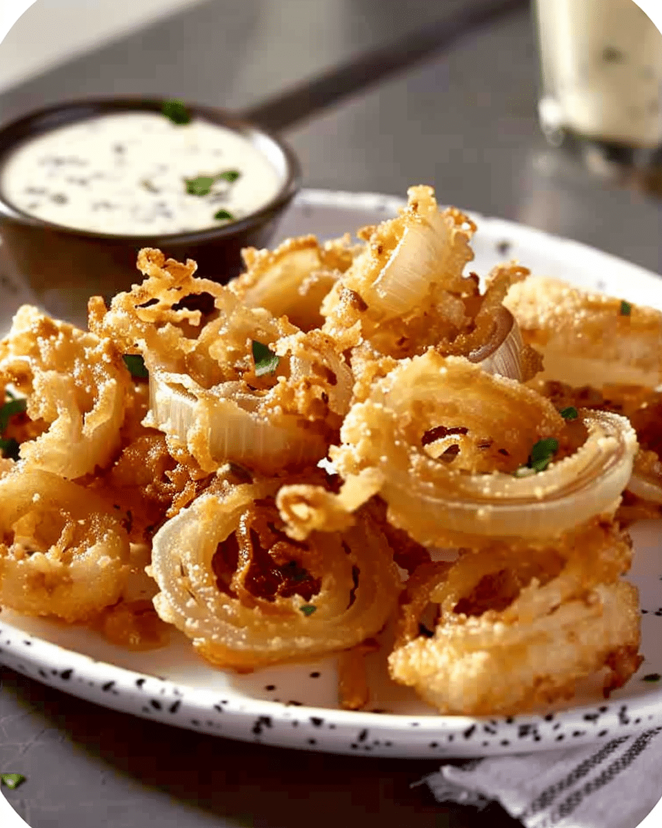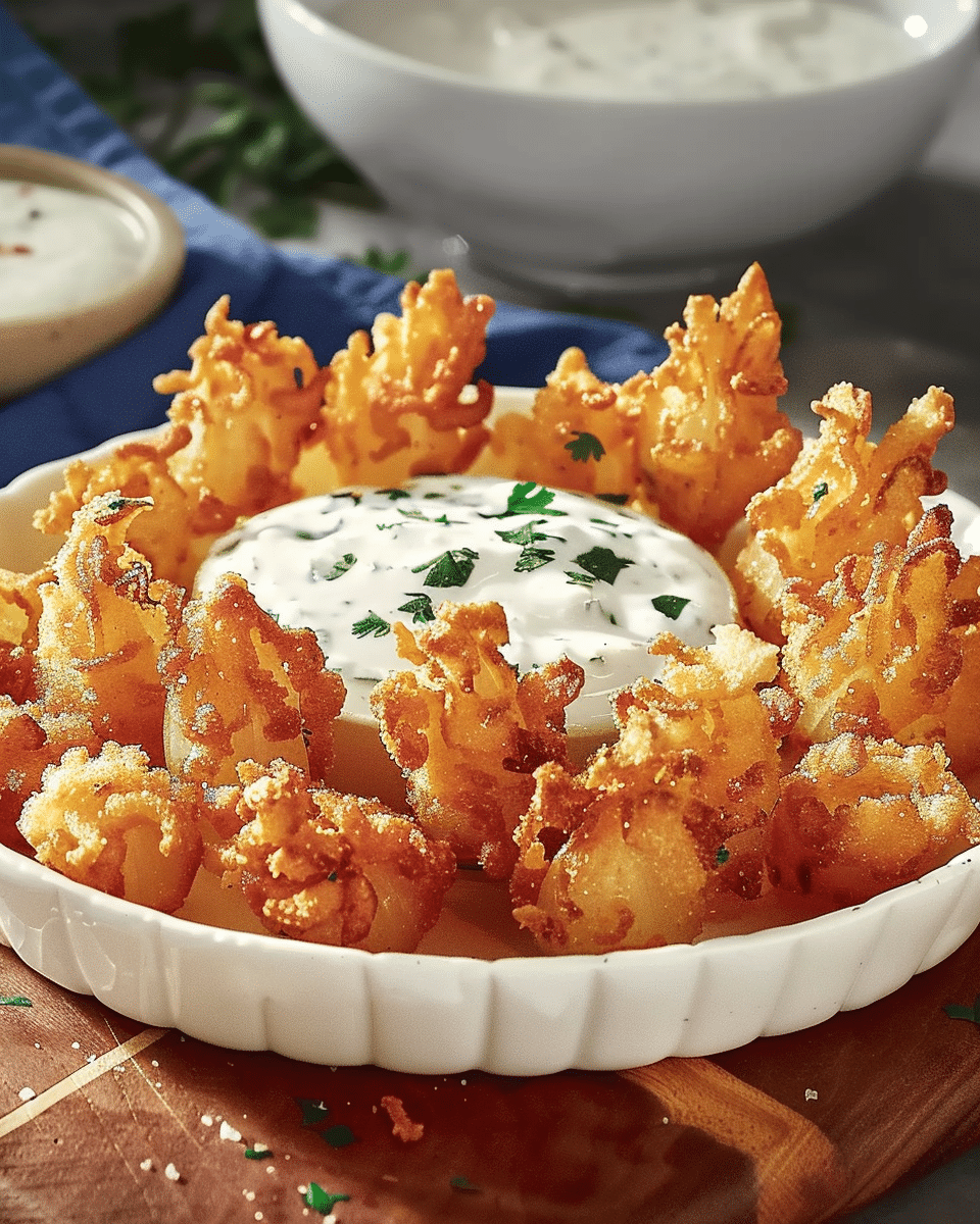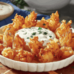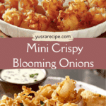 These mini crispy blooming onions are bite-sized, deep-fried delights with tender sweet onion centers and ultra-crispy petals, served with a creamy, tangy buttermilk ranch dip — perfect for parties or snacks.