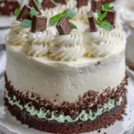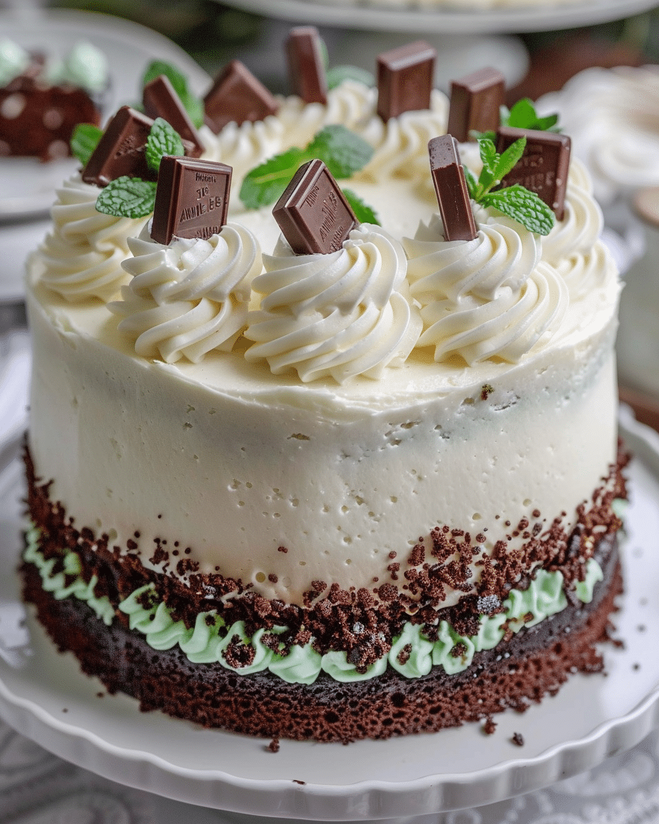Store any leftover cake covered in the refrigerator for up to 4–5 days. Because it contains whipped cream and pudding, keep it cold and do not leave it out at room temperature for more than 2 hours. If you’d like to freeze: you may freeze an un-frosted version of the soaked cake layer (wrapped well) for up to 2 months; thaw in the refrigerator, then add the mint topping and candies just before serving.