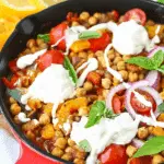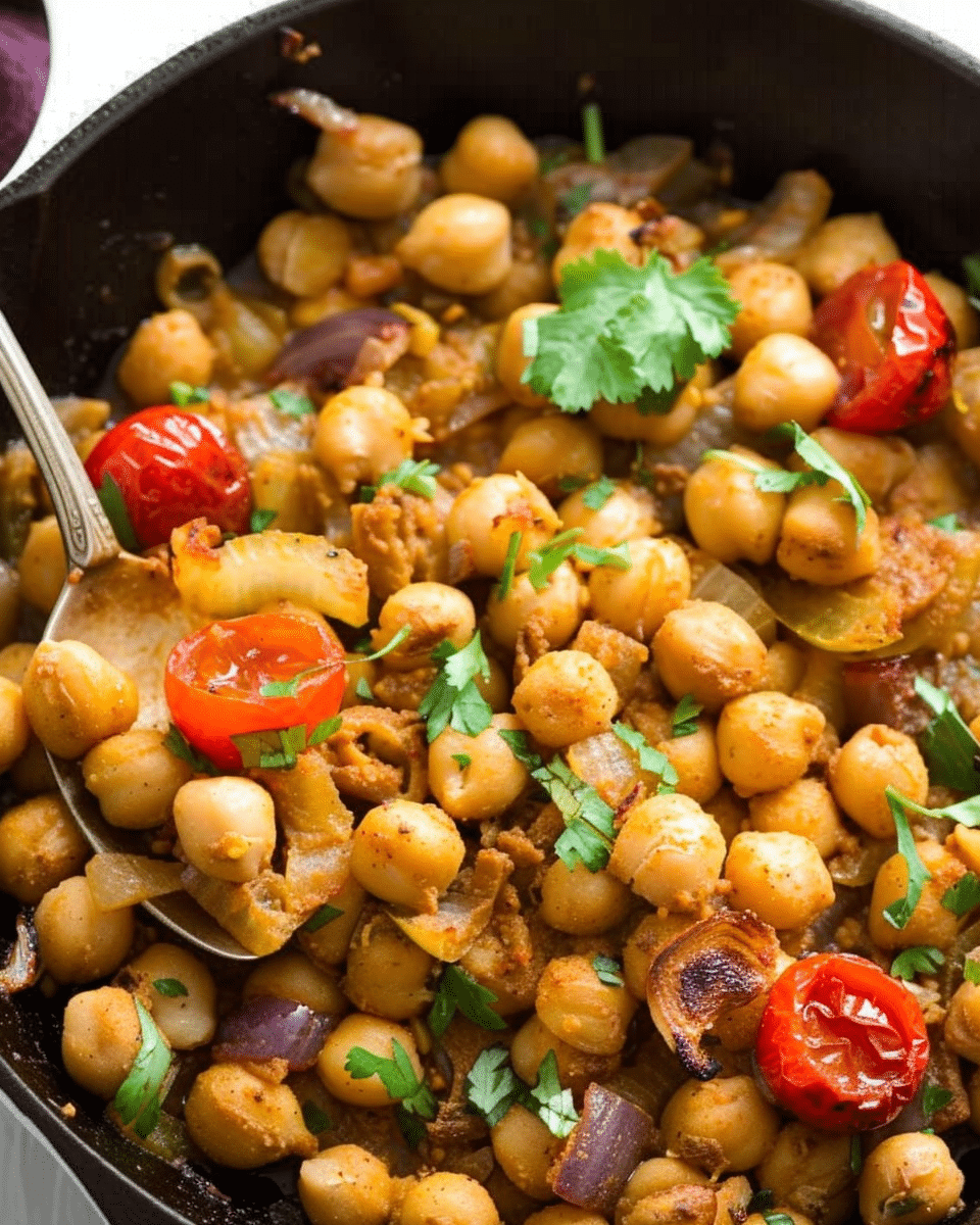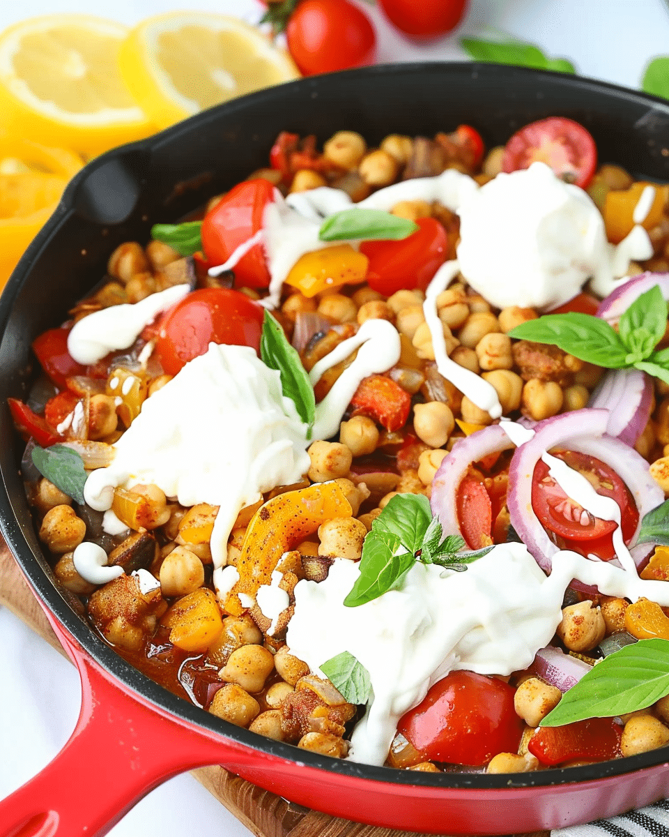 A simple, one-skillet Moroccan-inspired dish made with roasted chickpeas, tomatoes, red onion, and ras el hanout. Finished with lemon zest, yogurt, and fresh herbs, it’s flavorful, comforting, and perfect for a quick vegetarian meal.