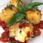 Tender chicken meatballs stuffed with gooey mozzarella, infused with basil and baked to golden perfection. A versatile and cheesy dish perfect as an appetizer or main course.