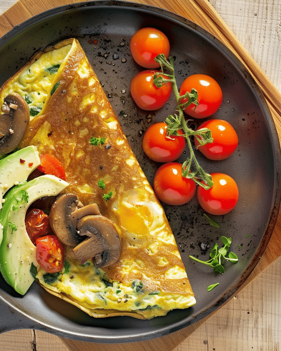 A nutritious and flavorful mushroom and spinach omelette, paired with creamy avocado and roasted cherry tomatoes. Perfect for a quick breakfast or light meal.