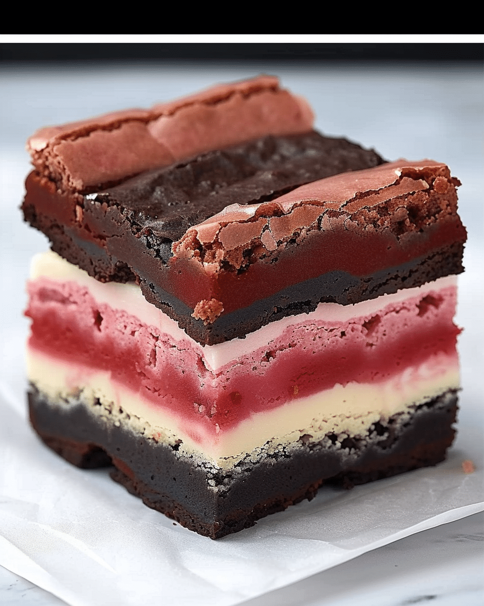 A decadent and colorful twist on the classic brownie, these Neapolitan Dream Brownies combine three irresistible layers—rich chocolate, sweet strawberry, and creamy vanilla—topped with luscious chocolate icing, buttery brown sugar crumbs, and fresh strawberries. Each bite delivers a nostalgic flavor reminiscent of Neapolitan ice cream, but in a soft, fudgy brownie form.