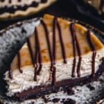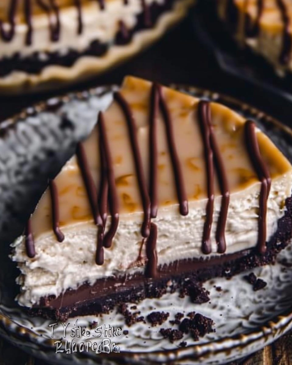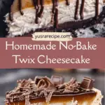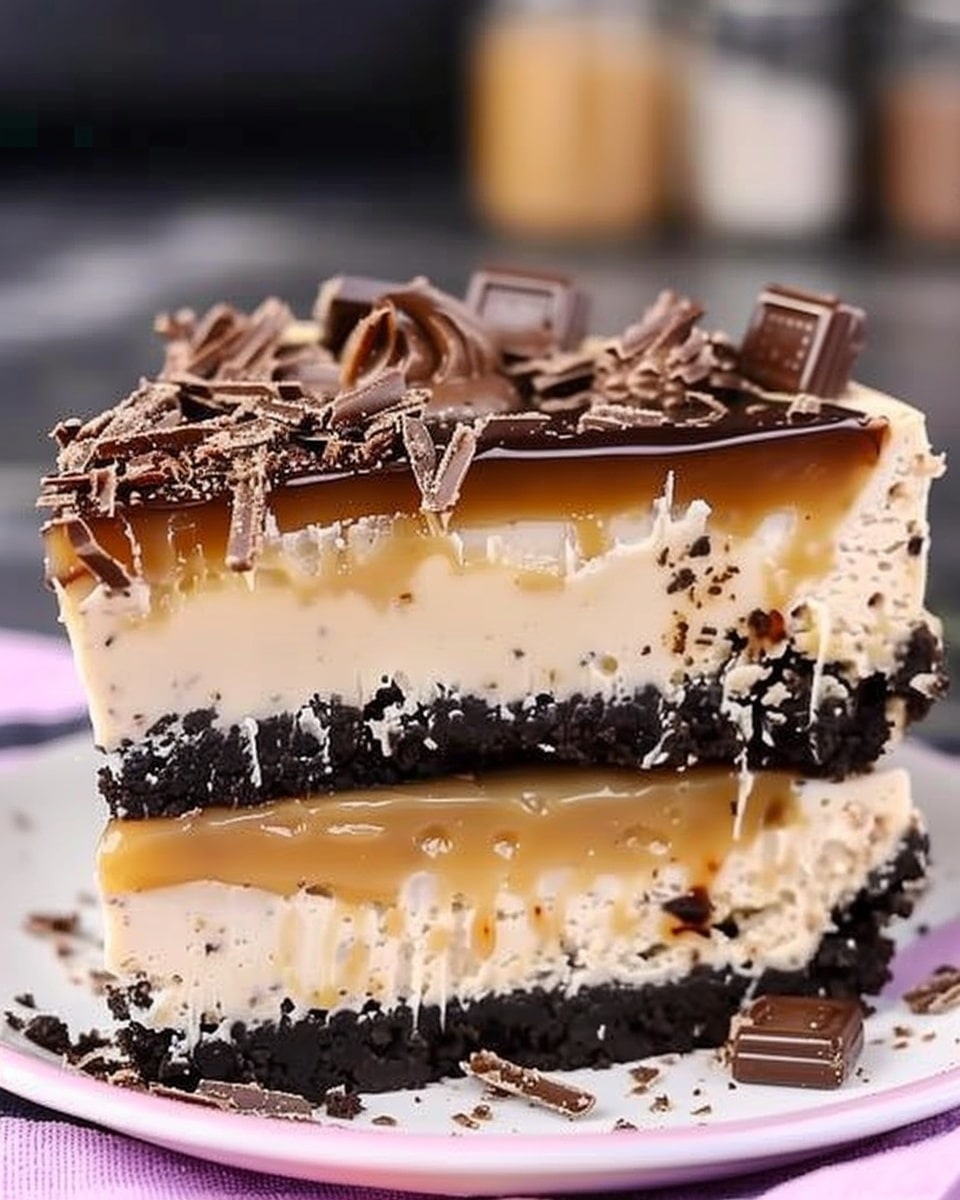 A rich and creamy no-bake cheesecake inspired by Twix bars, featuring layers of graham cracker crust, smooth chocolate, velvety cheesecake filling, and sweet caramel in every bite.