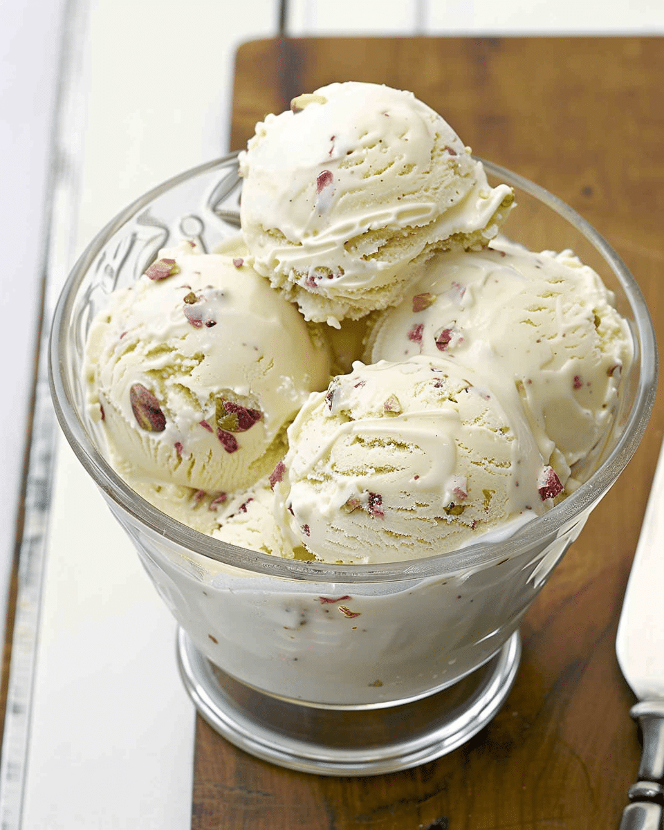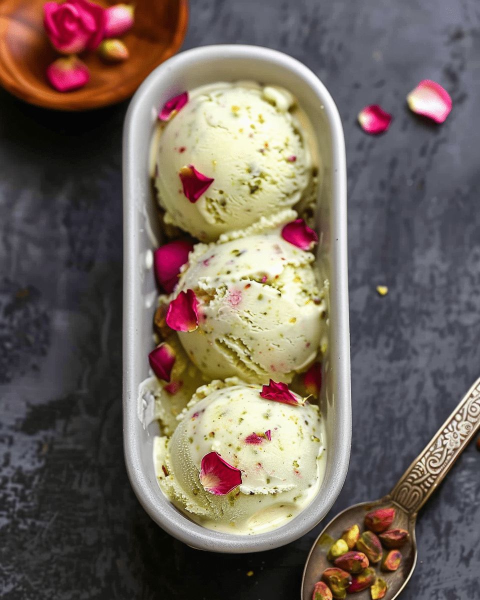 This recipe brings together Middle Eastern–inspired flavors in a way that feels both unique and comforting. Rose water adds gentle floral depth, cardamom provides warmth and fragrance, and pistachios contribute texture and nuttiness. The best part is how incredibly simple it is—just mix, freeze, and enjoy. It’s a beautiful choice for dinner parties, summer gatherings, or for stocking your freezer with a special treat.