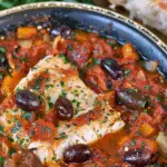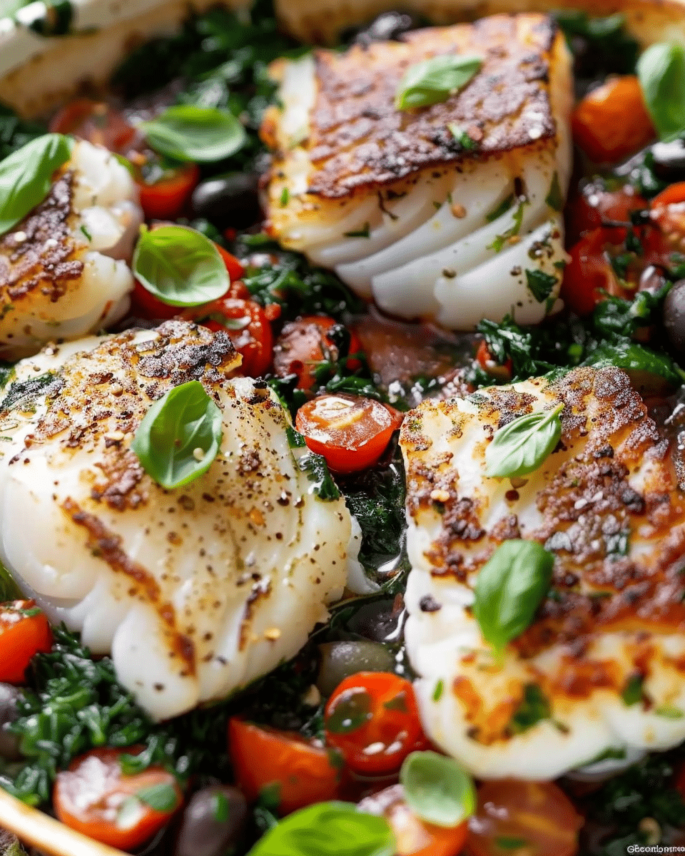 A flavorful and comforting one-pan meal where tender cod fillets are baked over a spiced tomato and Mediterranean vegetable base. Rose harissa adds gentle heat while fresh herbs and olives create a rich, vibrant dish perfect for weeknights or guests.