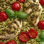 This vibrant, one-pan pesto chicken and orzo brings together juicy chicken, fragrant basil pesto, tender orzo, and a fresh tomato-basil topping. It’s a weeknight-friendly dish that feels bright, comforting, and elegant all at once.