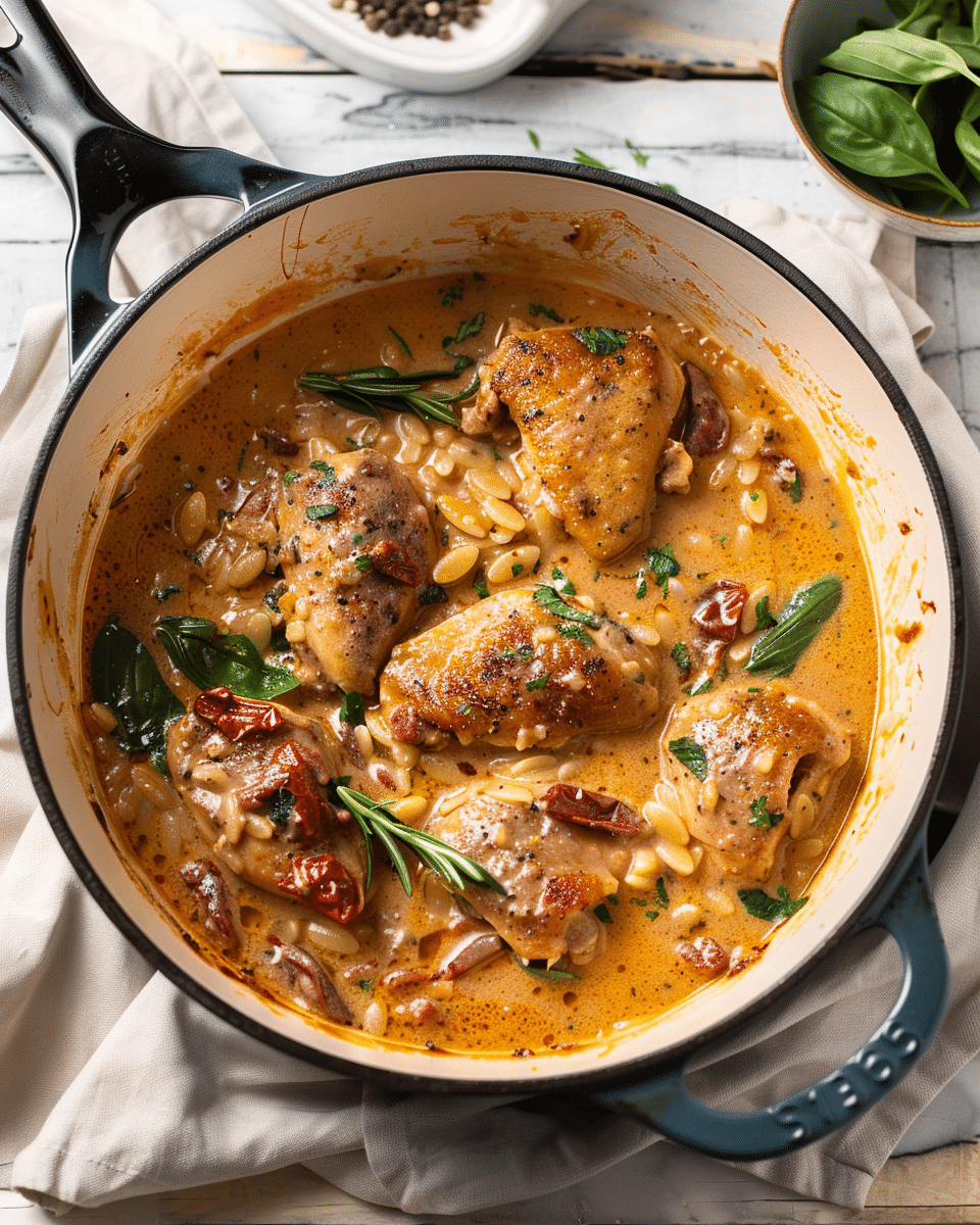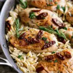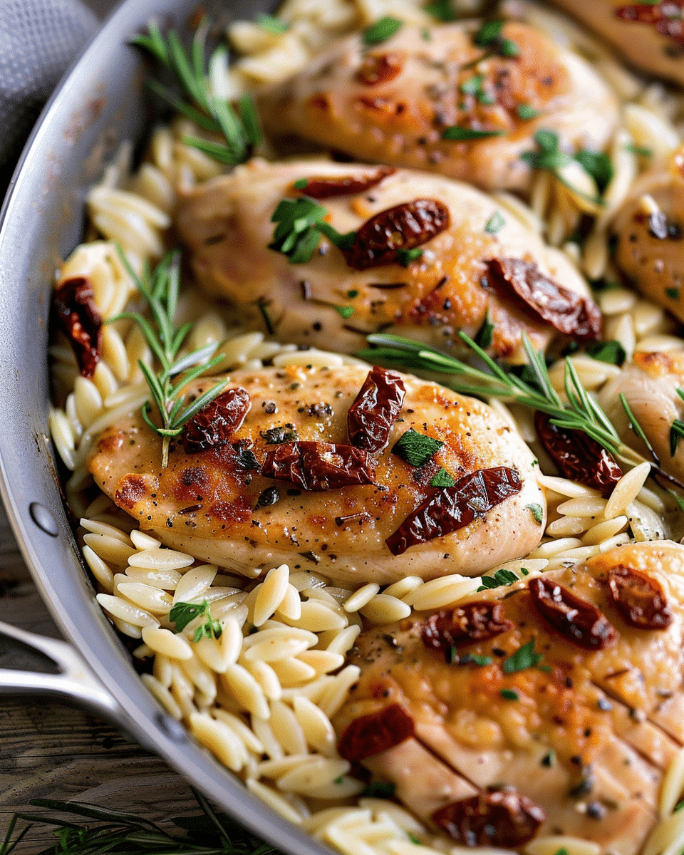This creamy sun-dried tomato chicken and orzo is a one-skillet meal featuring seared chicken, tender orzo, fresh spinach, and a rich sun-dried tomato cream sauce. It’s easy, comforting, and perfect for weeknights or gatherings.