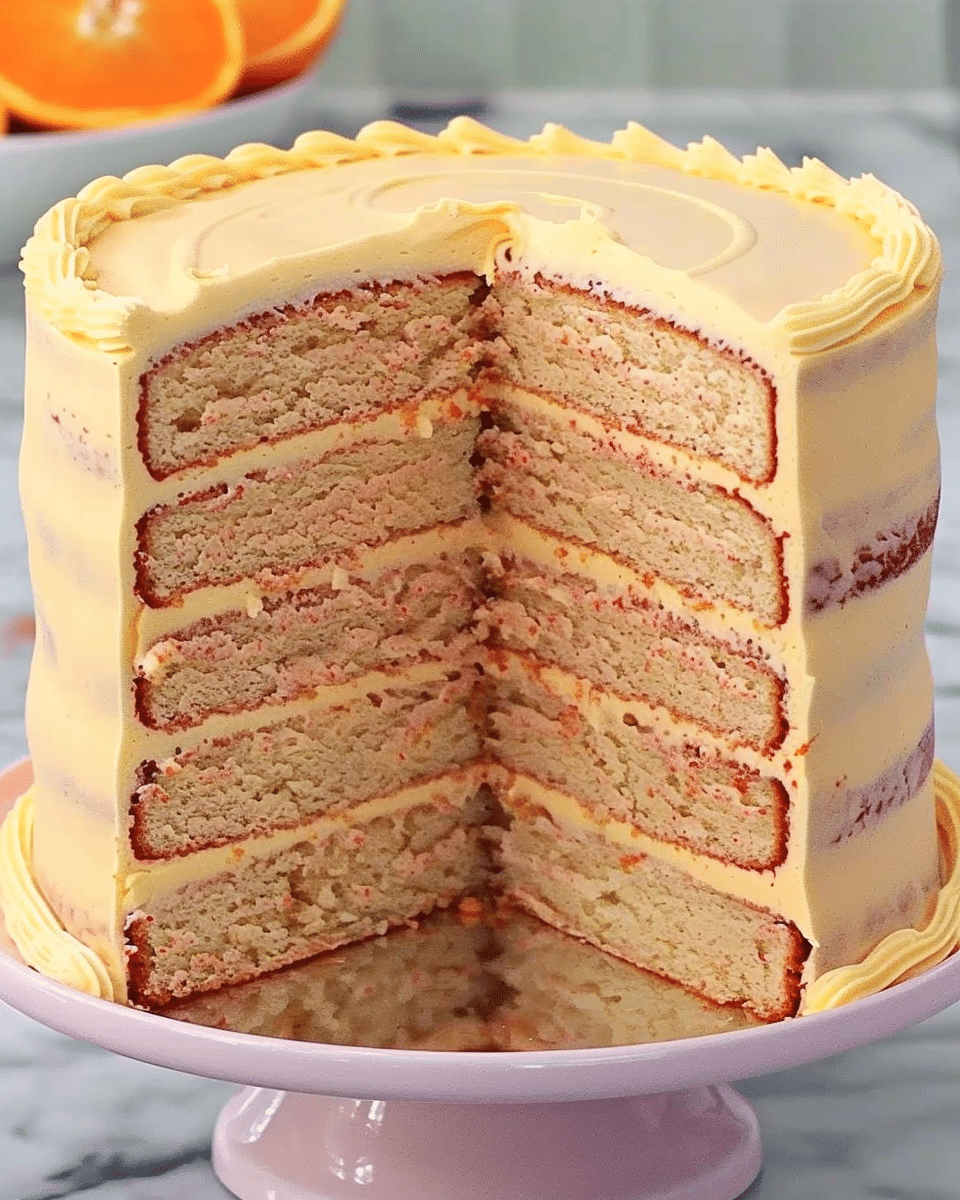 A bright and zesty Orange Velvet Cake layered with soft, fragrant cake and topped with creamy yellow buttercream frosting. Bursting with citrus flavor and perfect for any celebration.