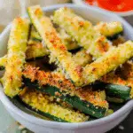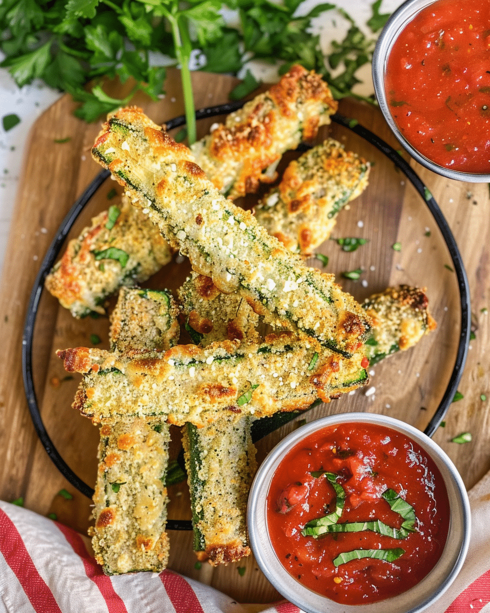 Store leftover zucchini fries in an airtight container in the refrigerator for up to 3 days. Avoid reheating in the microwave, as it will make them soggy. Instead, reheat in an air fryer at 375°F (190°C) for 3–5 minutes or in the oven at 400°F (200°C) for about 8 minutes until crisp again.