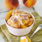 A classic baked dessert featuring juicy cinnamon-spiced peaches topped with tender buttermilk biscuit dough that bakes golden and crisp while the fruit becomes bubbling and syrupy.