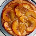 Place a serving plate over the pan and carefully invert the cake so the peaches and caramel form the top.