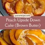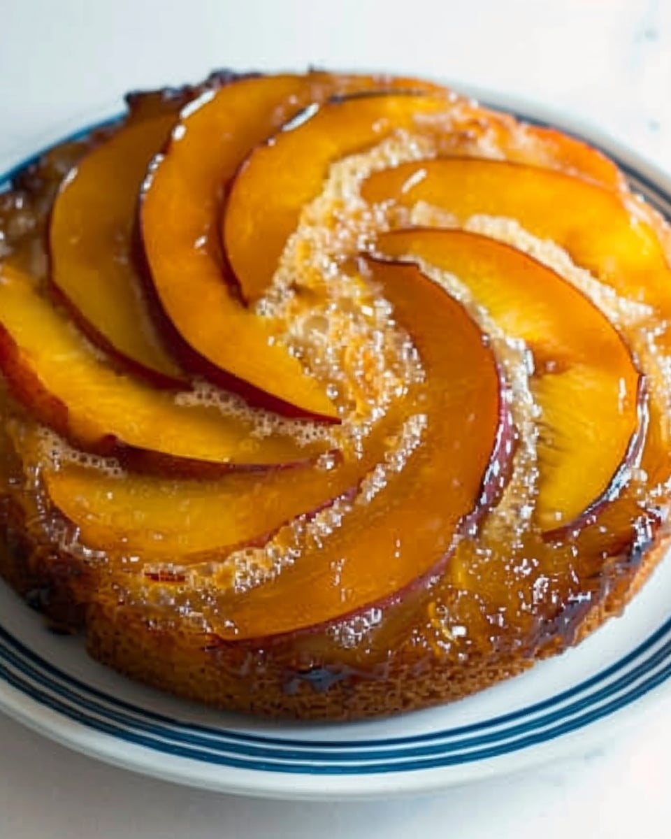 A moist peach upside down cake made with caramelized peaches and a soft brown butter cake, creating a glossy fruit topping and a warm cinnamon-scented dessert.