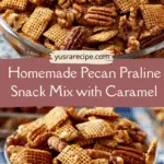 This pecan praline snack mix is a sweet, salty, and crunchy treat featuring cereal, pretzels, and pecans coated in a rich caramel glaze and baked to golden perfection. Great for snacking, gifting, or parties.