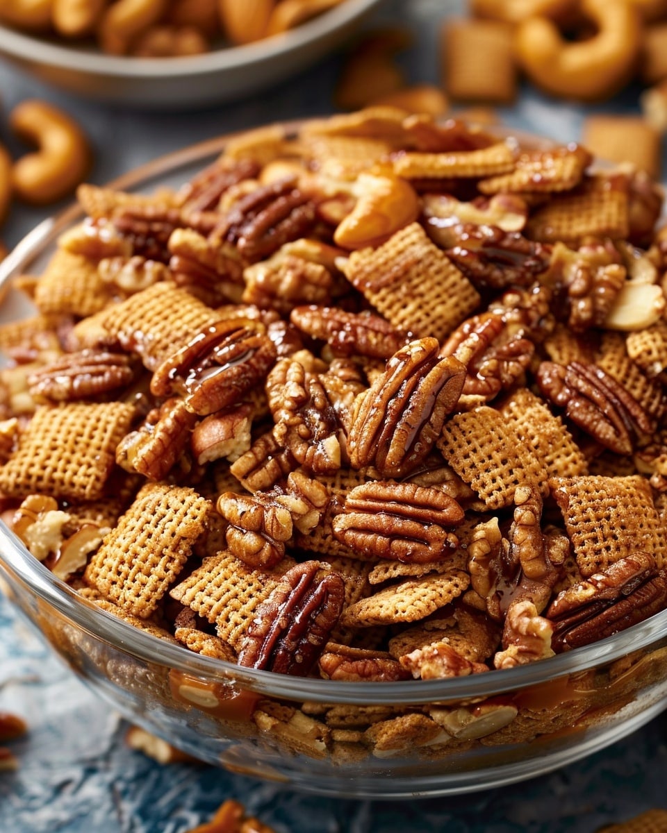 It delivers a satisfying mix of textures with crunchy cereal, crisp pretzels, and toasted pecans.