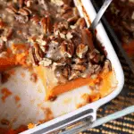 Bake the casserole for 30 minutes at 350°F, or until the pecan topping is golden and fragrant and the sweet potato layer is bubbling slightly around the edges. Let it cool for a few minutes before serving.