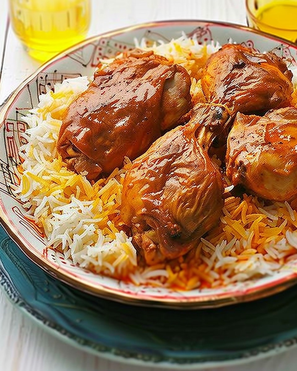 A classic Persian dish featuring saffron-simmered chicken served with fluffy basmati rice layered with warm spices and tart barberries, finished with golden onions and nuts for a fragrant and elegant meal.