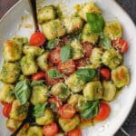 A vibrant one-skillet pesto gnocchi dish made with pillowy potato gnocchi, juicy cherry tomatoes, tender zucchini, and creamy white beans, all tossed in a bright lemon pesto sauce. Perfect for quick weeknight dinners or fresh spring and summer meals.