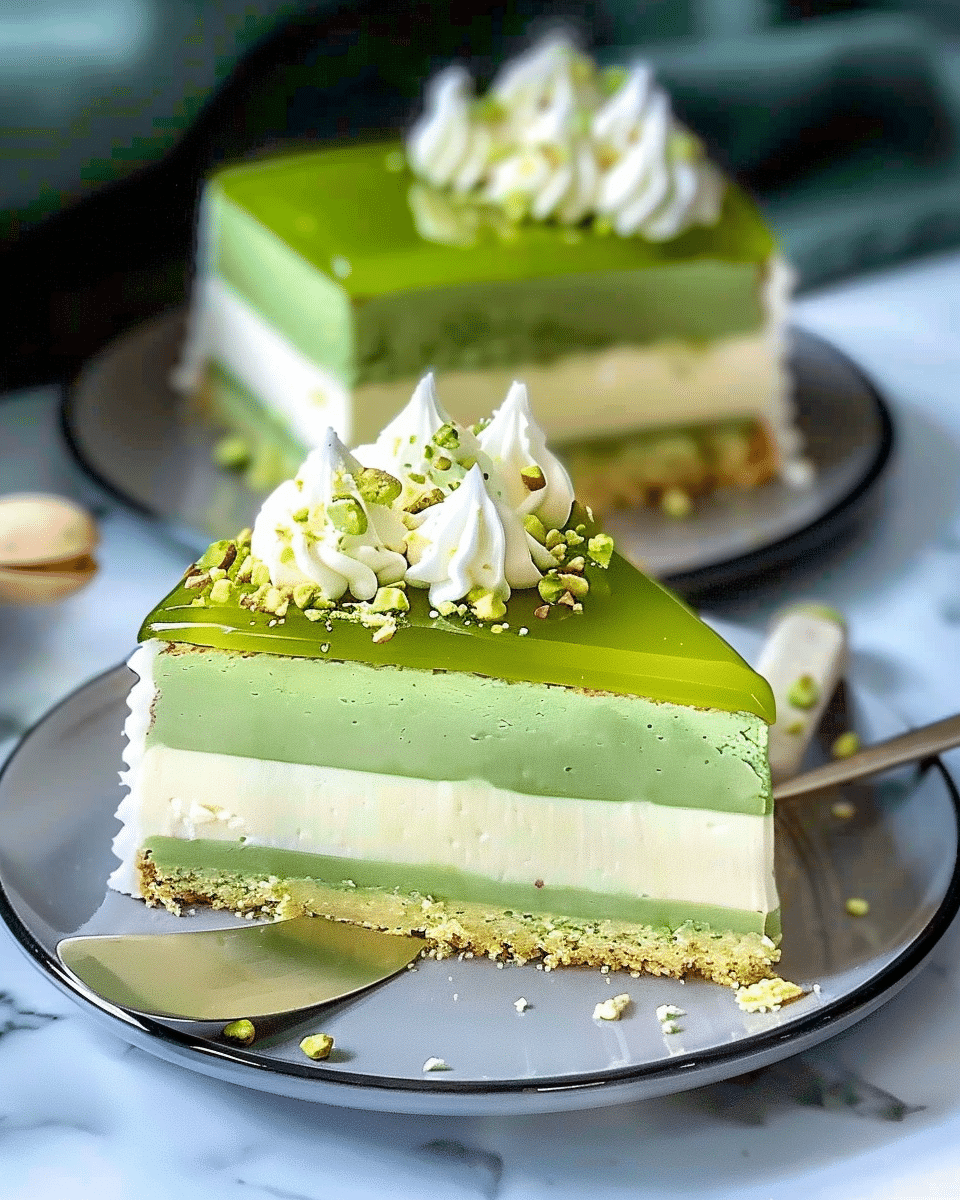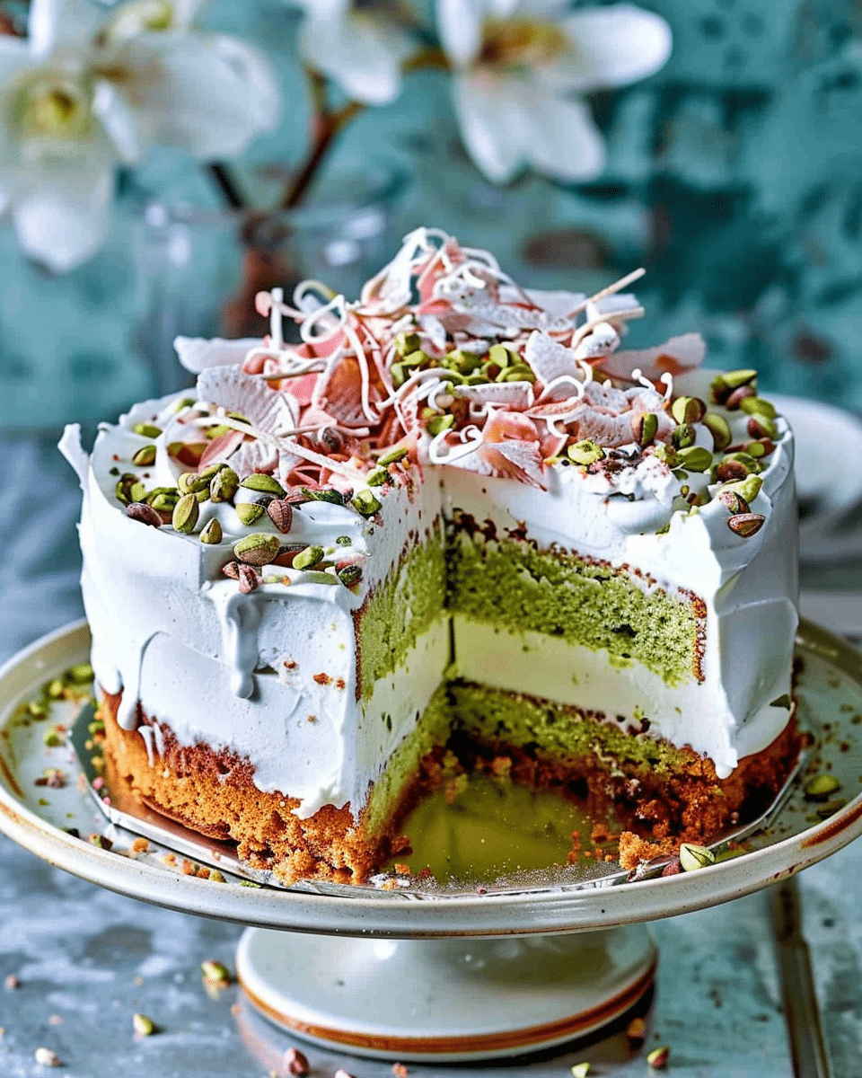 A soft, moist pistachio-flavored sponge cake layered with creamy mascarpone pistachio filling and topped with a glossy pistachio ganache. Elegant and nutty, perfect for special occasions.