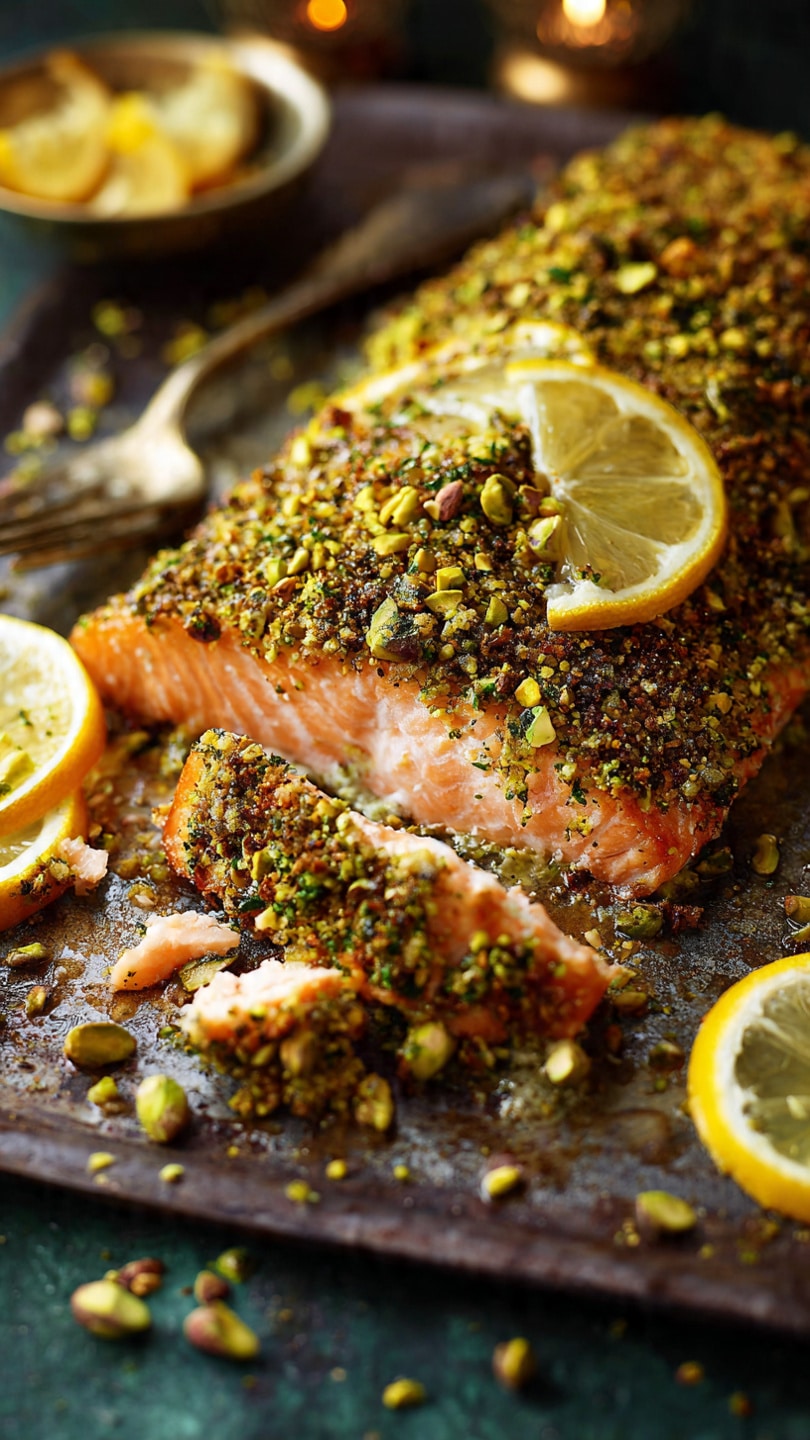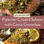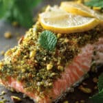 This pistachio crusted salmon with citrus gremolata is a quick and elegant seafood dish featuring tender baked salmon topped with a crunchy pistachio-herb crust and a bright, zesty gremolata for a fresh finish.