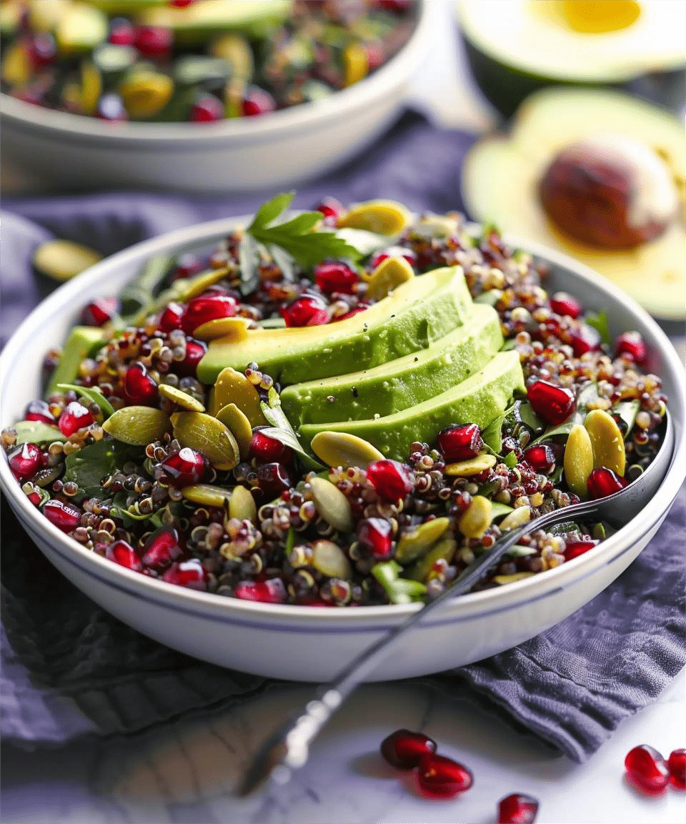 This recipe is a perfect blend of simplicity and elegance. It comes together in under 30 minutes, relies on wholesome plant-based ingredients, and delivers a satisfying mix of textures and flavors. The quinoa provides sustaining protein and slow-digesting carbohydrates, the avocado adds luscious creaminess, the pomegranate brings a sparkling burst of sweetness, and the nuts offer earthy crunch. It’s naturally vegan, gluten-free, and full of antioxidants—proof that a nourishing meal can be incredibly delicious and easy to prepare.