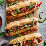 These pressed Italian sandwiches are packed with briny, herby, tangy flavor in every bite. Built on a crusty ciabatta loaf and layered with olive tapenade, halal deli slices, mozzarella, roasted red pepper, artichoke hearts, and fresh basil, they are the kind of make-ahead sandwich that feels effortless yet impressive. They are perfect for picnics, summer lunches, road trips, or an easy no-cook dinner.