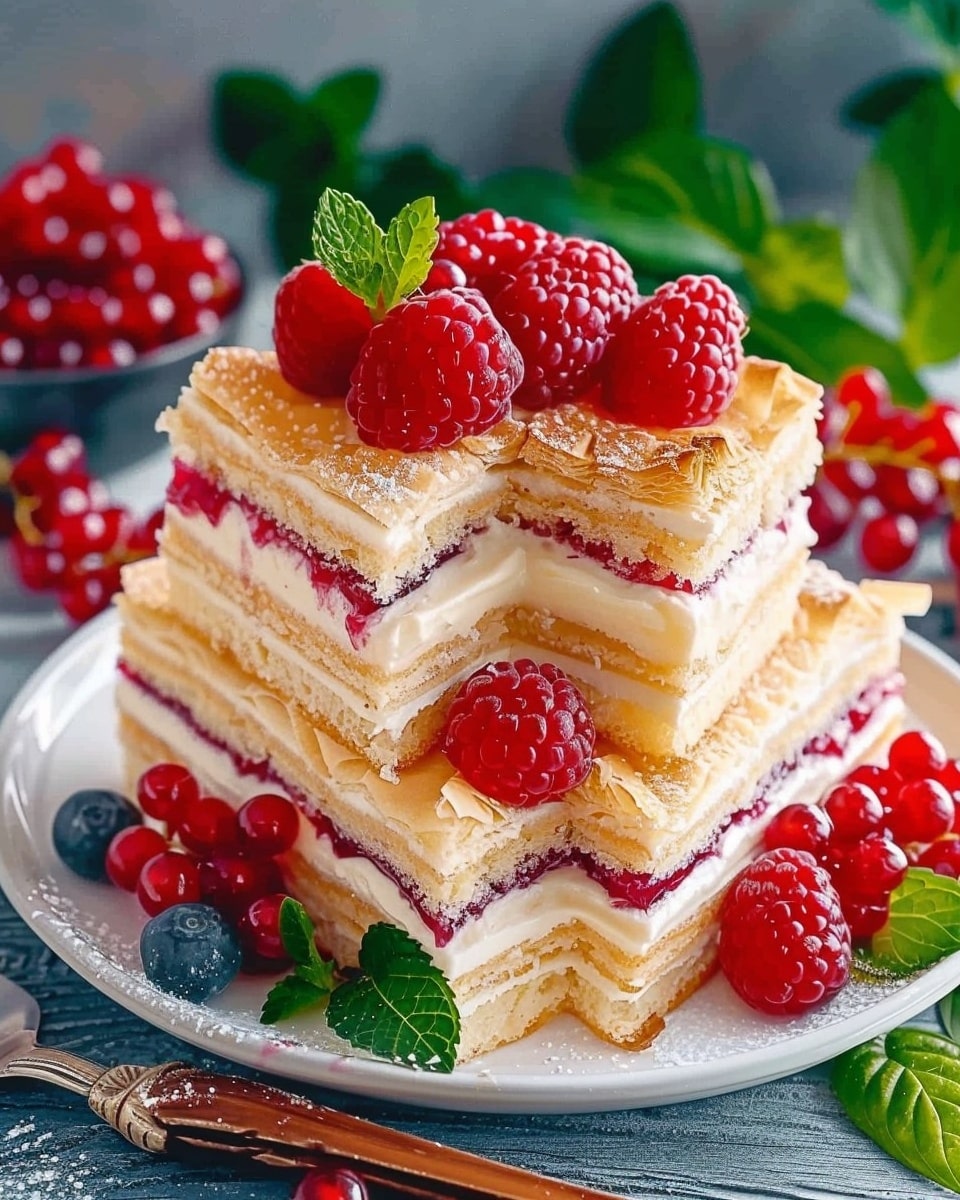 A stunning layered dessert made with flaky golden puff pastry, silky vanilla cream, and a bright fruit jam layer. This elegant cake delivers bakery-quality flavor and texture with surprisingly simple preparation.