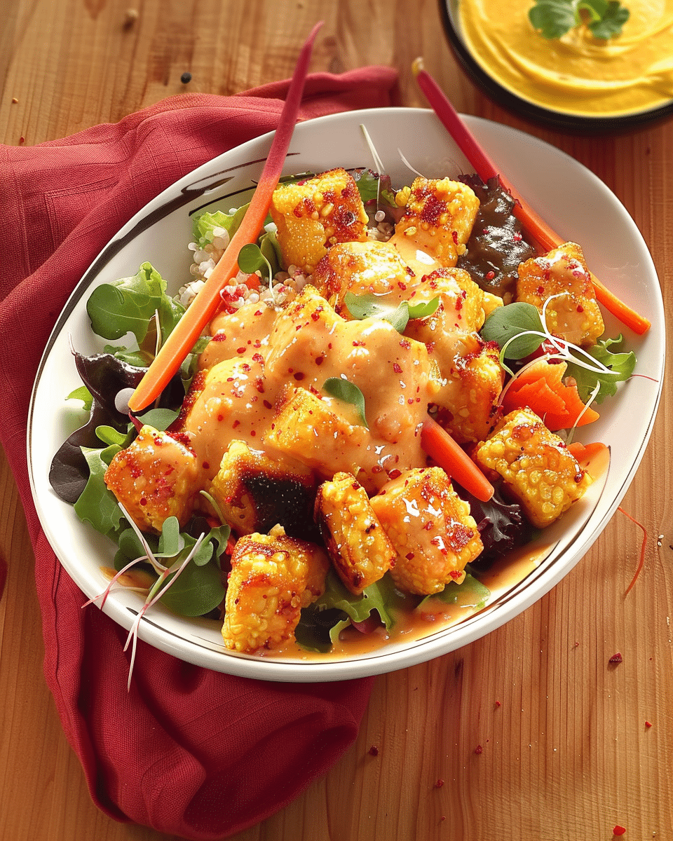 A vibrant, nourishing bowl featuring fluffy quinoa, crisp vegetables, creamy avocado, and roasted tofu, all tied together with a bright, tangy Carrot Ginger Sauce. This dish is colorful, refreshing, and packed with plant-based goodness.
