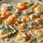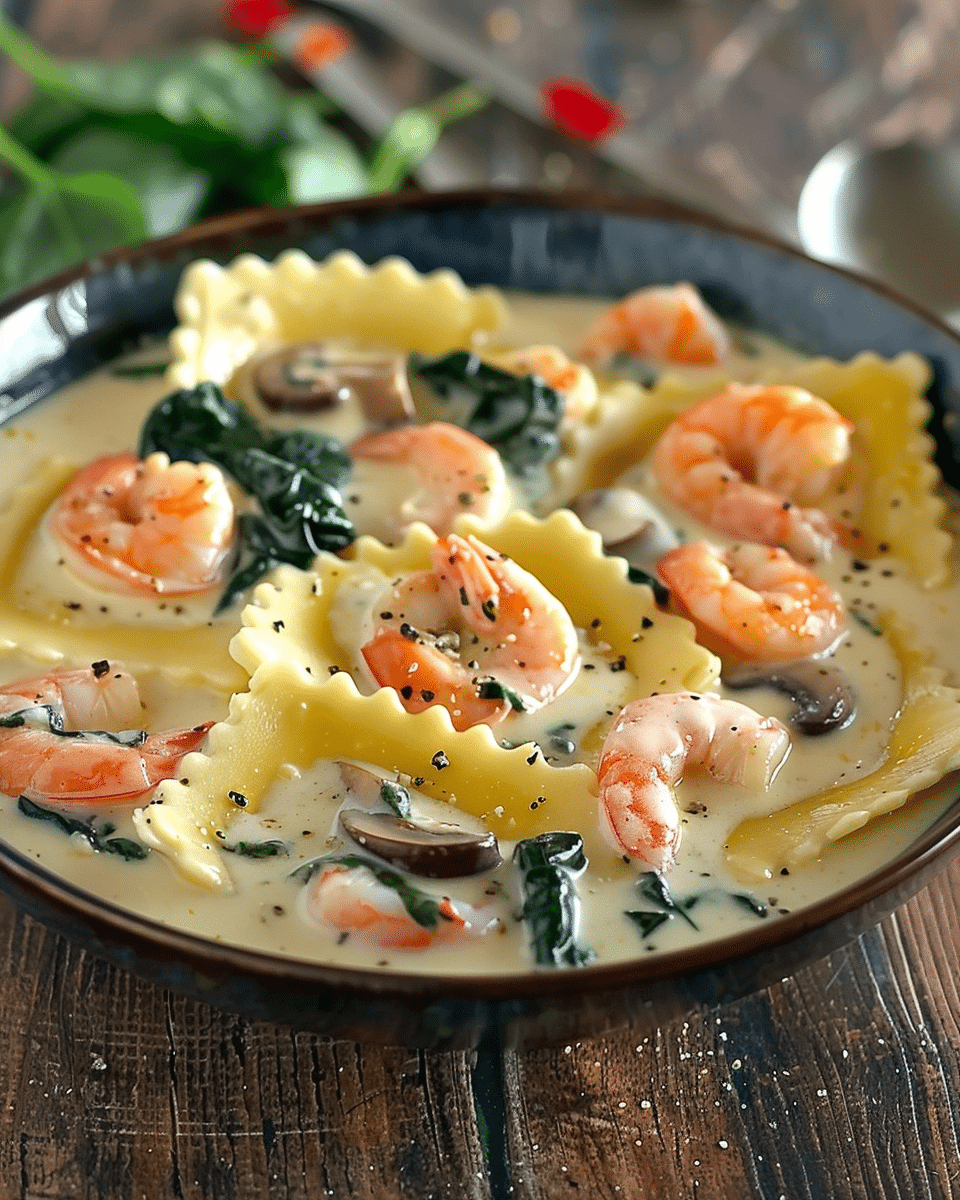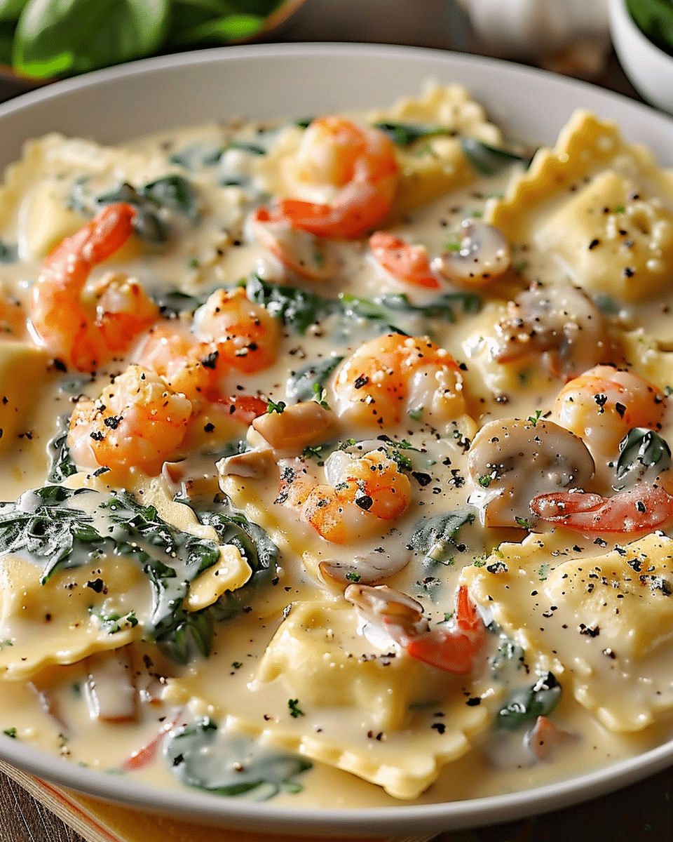 This comforting and elegant pasta dish combines tender ravioli with juicy shrimp, optional scallops or white fish, fresh spinach, and earthy mushrooms, all coated in a rich, creamy garlic sauce. I love how luxurious it tastes while still being quick enough to prepare on a busy weeknight. The flavors blend beautifully—the sweetness of the seafood, the depth of the mushrooms, and the sharpness of Parmesan all come together in a silky, savory sauce that clings to every bite of pasta.
