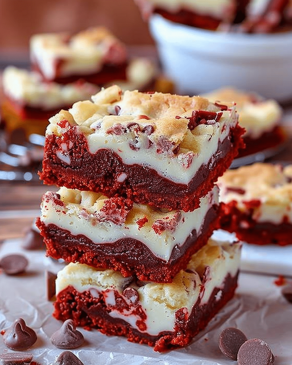A soft, chewy, vibrant red cookie bar packed with sweet white chocolate chips—simple to make, visually striking, and irresistibly delicious. These bars bring the nostalgic flavor of red velvet together with the ease of a traybake, making them perfect for gatherings, gifting, or an easy dessert at home.