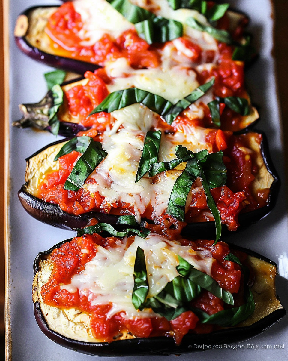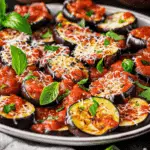 A rustic Mediterranean-inspired appetizer or light main dish featuring roasted eggplant slices topped with garlicky tomato sauce, fresh herbs, and salty cheese. Simple to make and full of vibrant flavor, it’s naturally gluten-free and easily made vegan.
