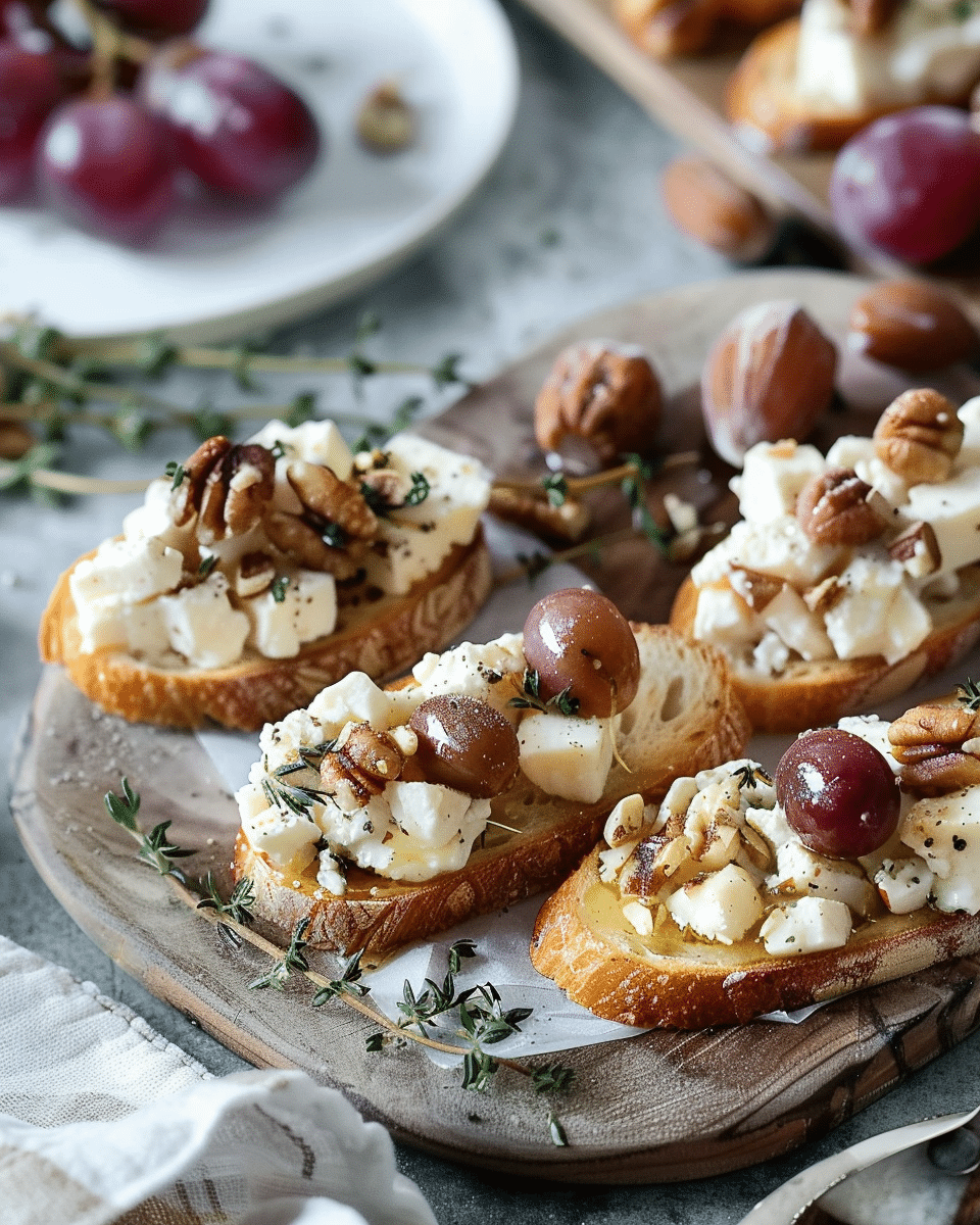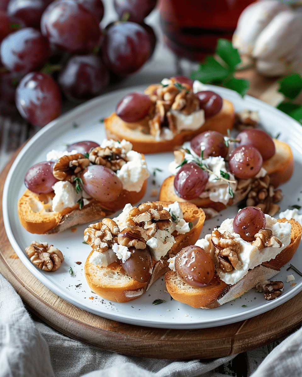 The combination of textures — crispy crostini, smooth cheese, soft roasted grapes, and crunchy nuts — creates an exciting eating experience.