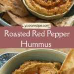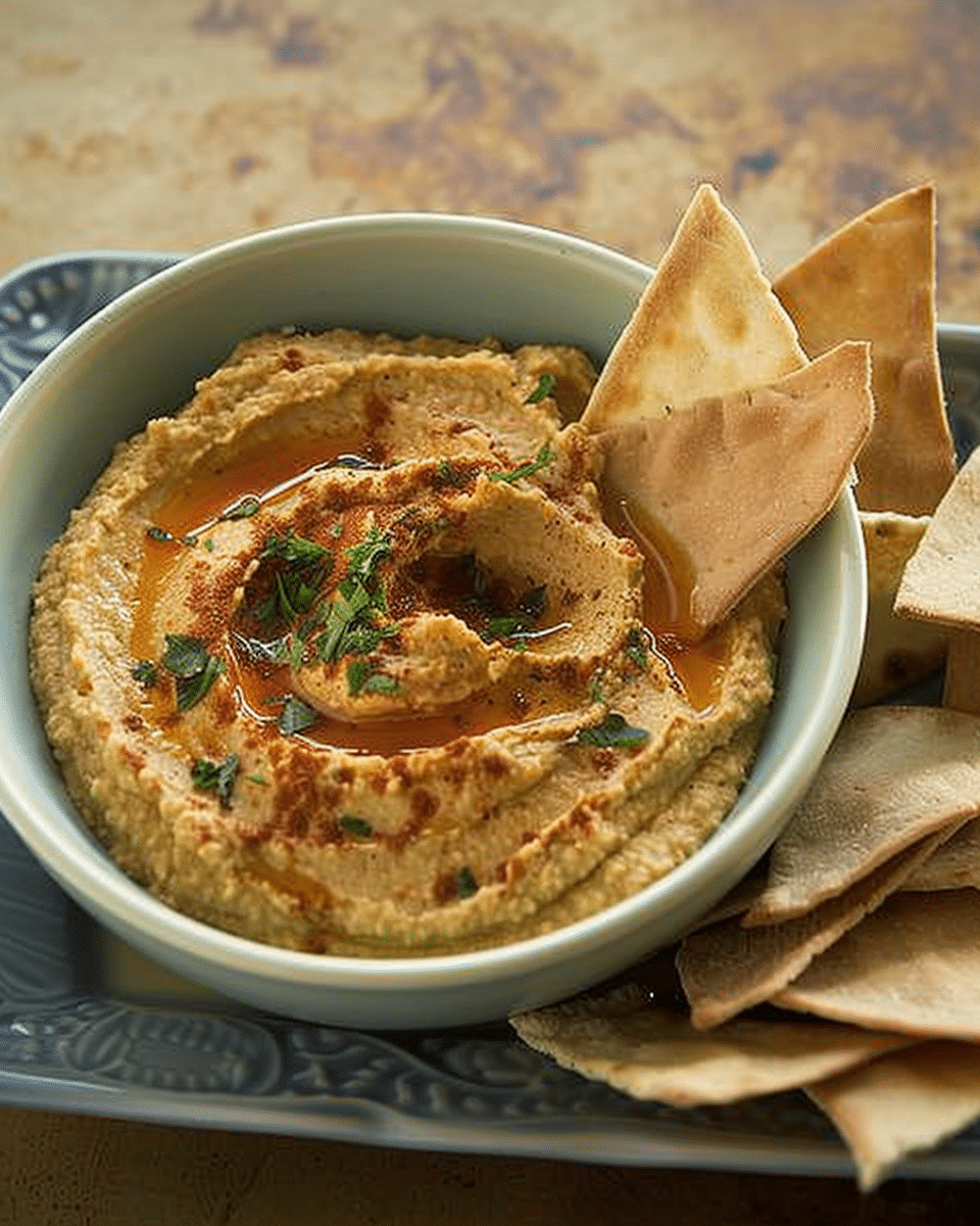 This creamy, flavorful hummus blends tender chickpeas with sweet roasted red peppers, garlic, tahini, lemon, and spices to form a smooth, vibrant dip. Paired with crisp homemade pita chips, it makes for a beautiful appetizer or snack that pleases in both taste and texture.