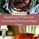 Sage-Roasted Turkey with Caramelized Onions and Sage Gravy is a timeless centerpiece that combines simplicity with rich, comforting flavor. The bed of sweet onions transforms the pan drippings into an unforgettable gravy, while sage and nutmeg provide warm, aromatic depth. Whether for a holiday gathering or a celebratory meal, this recipe delivers a beautifully roasted turkey that’s both impressive and deeply satisfying.