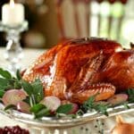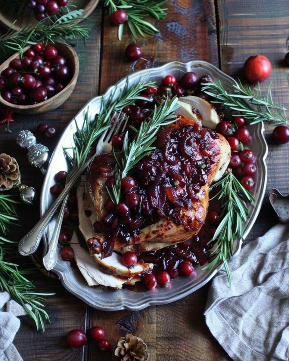 This recipe creates an exceptionally moist turkey with crisp, golden skin and remarkable depth of flavor. Roasting the bird over caramelized onions eliminates the need for a separate roasting rack while adding incredible richness to the gravy. The combination of fresh sage and nutmeg provides warmth and a classic holiday aroma. The onions naturally sweeten as they cook, balancing the savory turkey drippings perfectly. It’s impressive enough for special occasions yet straightforward enough for confident home cooks.