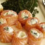 Unwrap and slice the chilled salmon into 6 equal pinwheels. Secure loose ends with toothpicks.