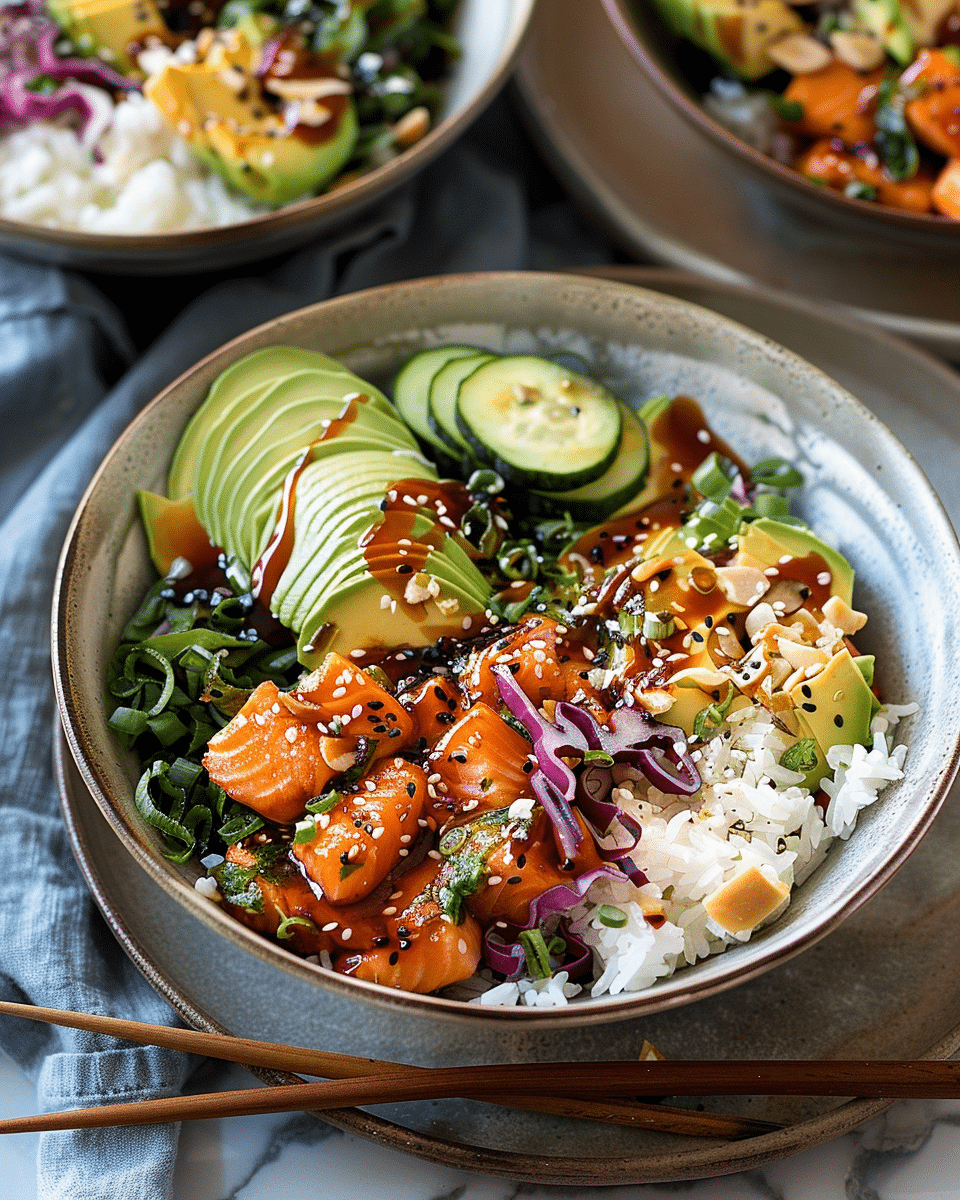 - Assemble each bowl with a base of rice, topped with salmon, slaw, avocado, and cucumber.