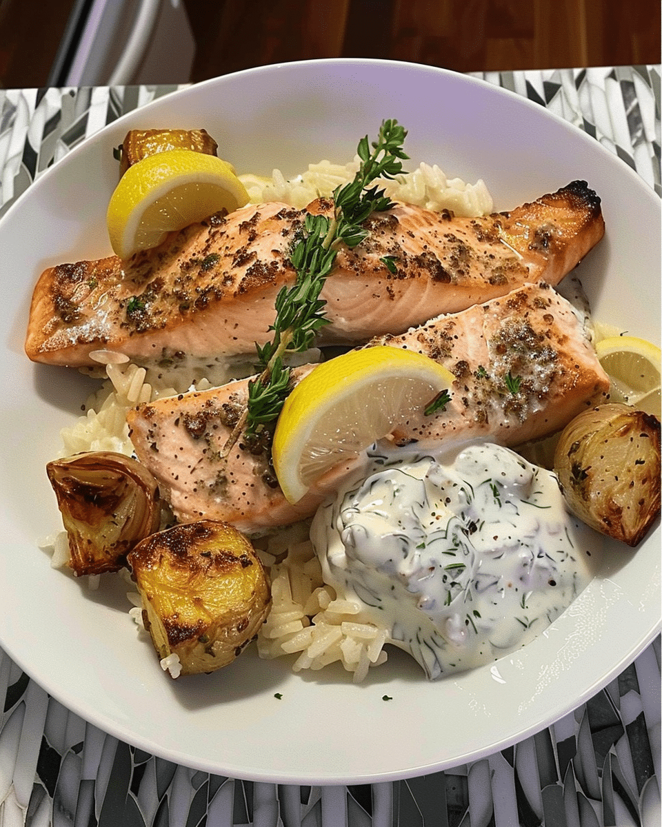 A simple and flavorful salmon dish featuring tender baked salmon fillets topped with a creamy, lemony herb yogurt sauce. Perfect for a light yet satisfying dinner, especially when paired with roasted vegetables.