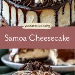 Samoa Cheesecake is a decadent dessert inspired by the iconic Girl Scout cookie, featuring a chocolate cookie crust, creamy cheesecake center, and a caramel-coconut topping with chocolate and caramel drizzles. It’s perfect for holidays or celebrations.