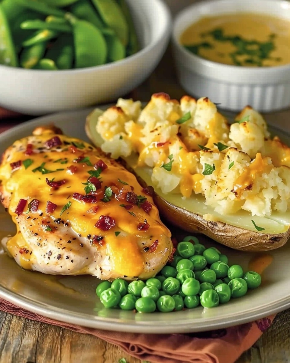 This recipe stands out because it uses everyday ingredients to create a complete and delicious meal without complicated techniques. The chicken is seasoned just right, giving it a golden, flavorful crust while remaining tender inside. The baked potato becomes soft and fluffy, perfectly complemented by melted cheese and butter. Meanwhile, the sweet peas add a fresh, slightly sweet contrast that balances the richness of the dish.