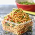 These noodles are best enjoyed cold or at cool room temperature, so reheating is usually unnecessary. Before serving leftovers, give them a quick toss to redistribute the dressing. If the noodles seem a little firm after chilling, let them sit out for a few minutes before eating.