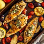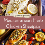 Sheet Pan Mediterranean Chicken and Veggies is a healthy, one-pan meal featuring juicy chicken breasts, colorful vegetables, and bold Mediterranean flavors like oregano, garlic, olives, and feta. With easy prep and cleanup, it’s perfect for busy weeknights or meal prep.
