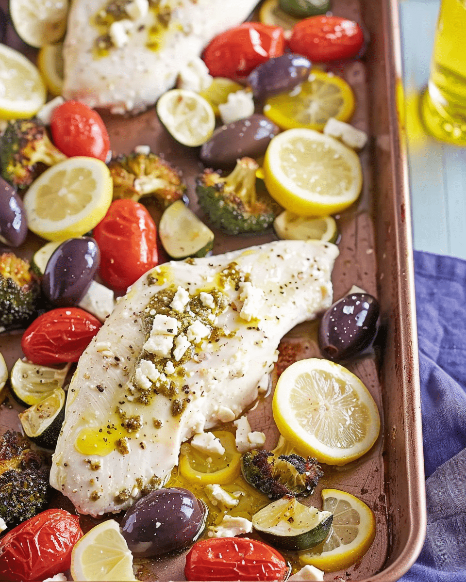 This vibrant Mediterranean-inspired sheet pan chicken dinner is the perfect balance of fresh, colorful vegetables, juicy chicken, and zesty seasoning. Everything roasts together in one pan, making it a simple, healthy, and hands-off meal that’s ideal for busy weeknights. With tangy olives, creamy feta, and a squeeze of roasted lemon, every bite bursts with fresh flavor and sunny Mediterranean vibes.