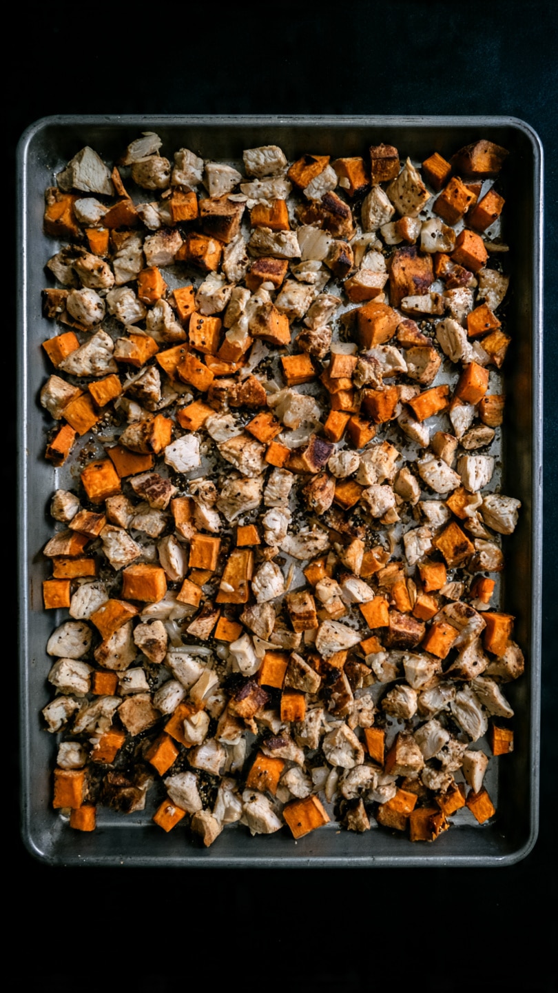 Bake, rotating the pan halfway through, until the chicken reaches an internal temperature of 165°F and the sweet potatoes are tender and caramelized, about 30 to 35 minutes.