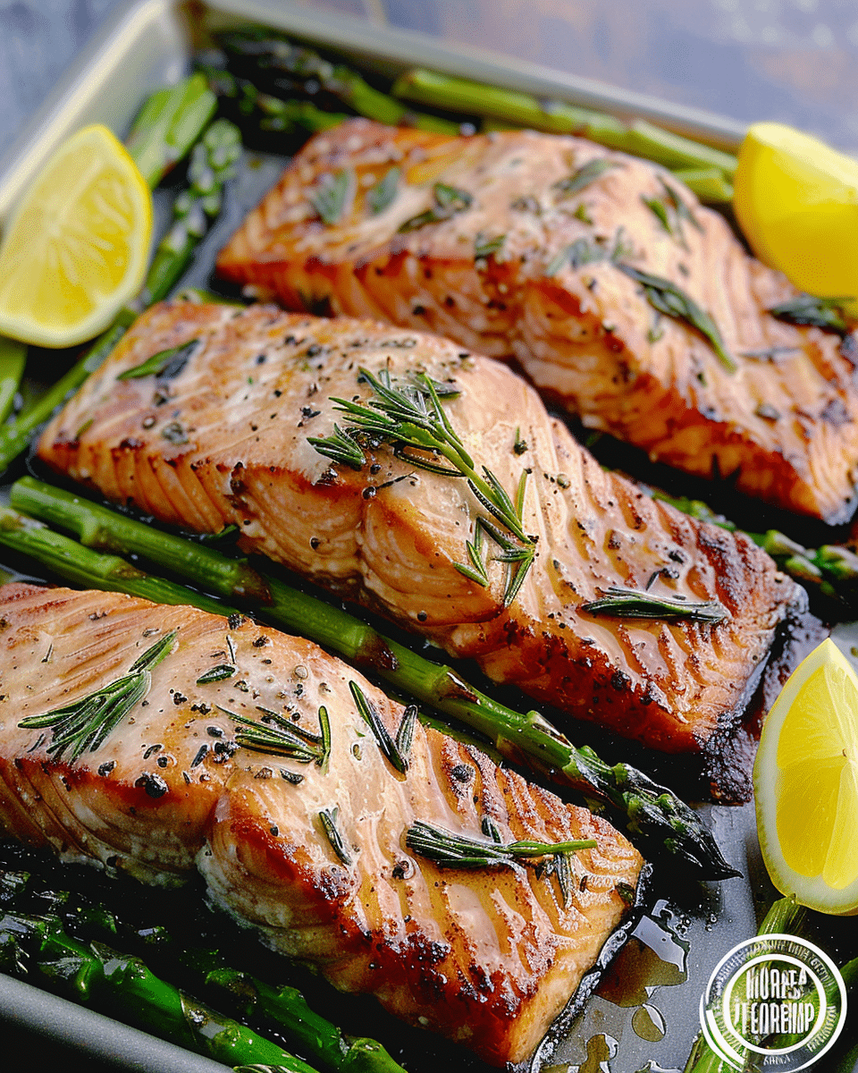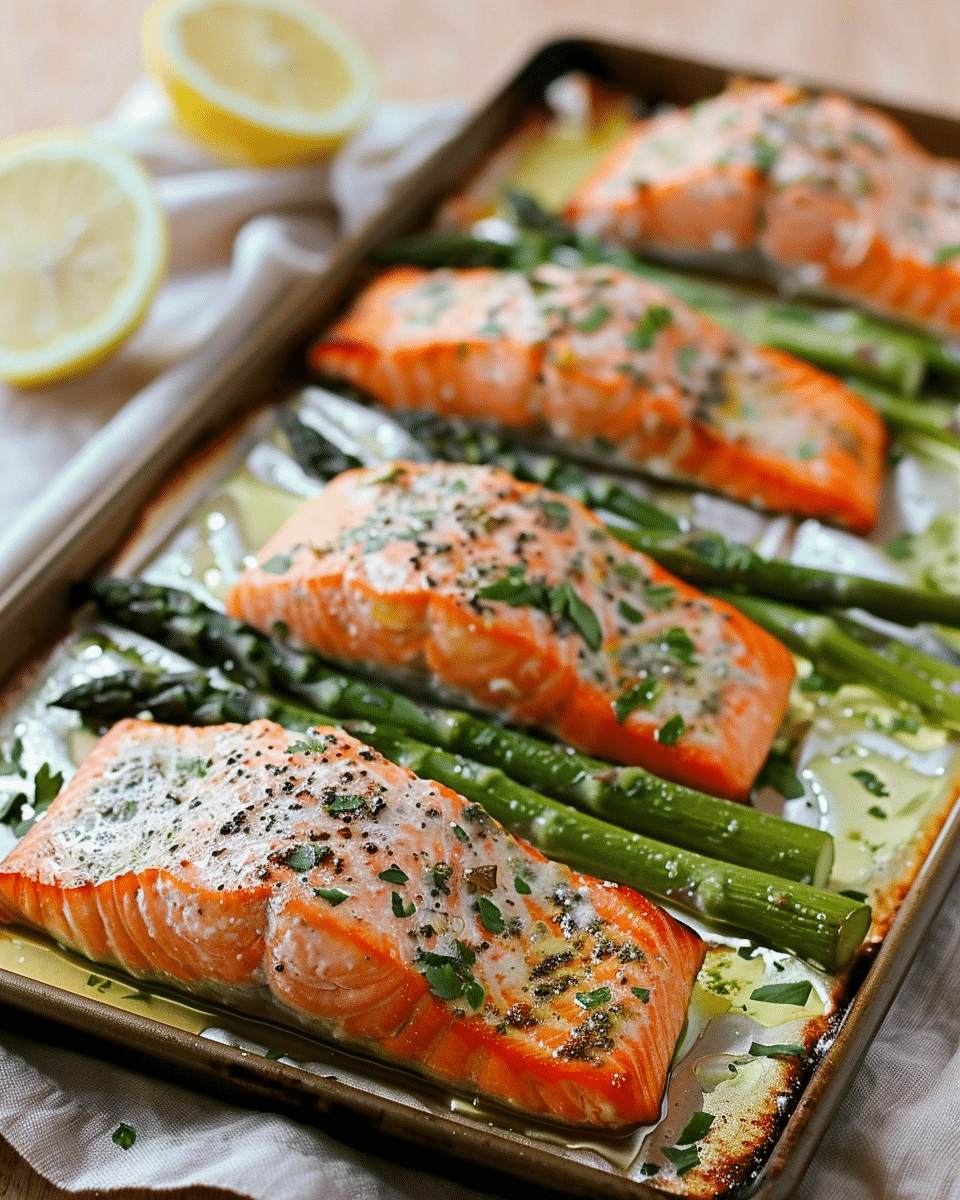 I’ve fallen in love with this one‑pan salmon and asparagus recipe. Everything cooks together on a single baking sheet with a lemon garlic herb butter that melts over the fish and vegetables, infusing them with rich flavor. In just about 20 minutes, I have a complete, healthy, and elegant meal ready with minimal cleanup and maximum satisfaction.