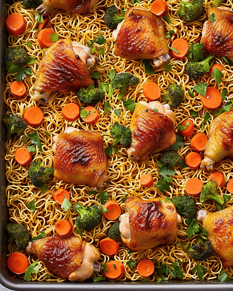 This sheet pan teriyaki chicken and ramen noodles recipe is a one-pan wonder featuring crispy ramen, juicy teriyaki-glazed chicken thighs, and roasted vegetables—all baked together for a fast, flavorful, and easy dinner.