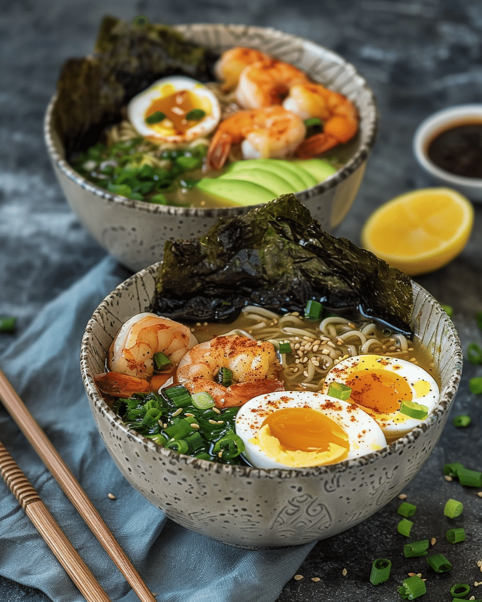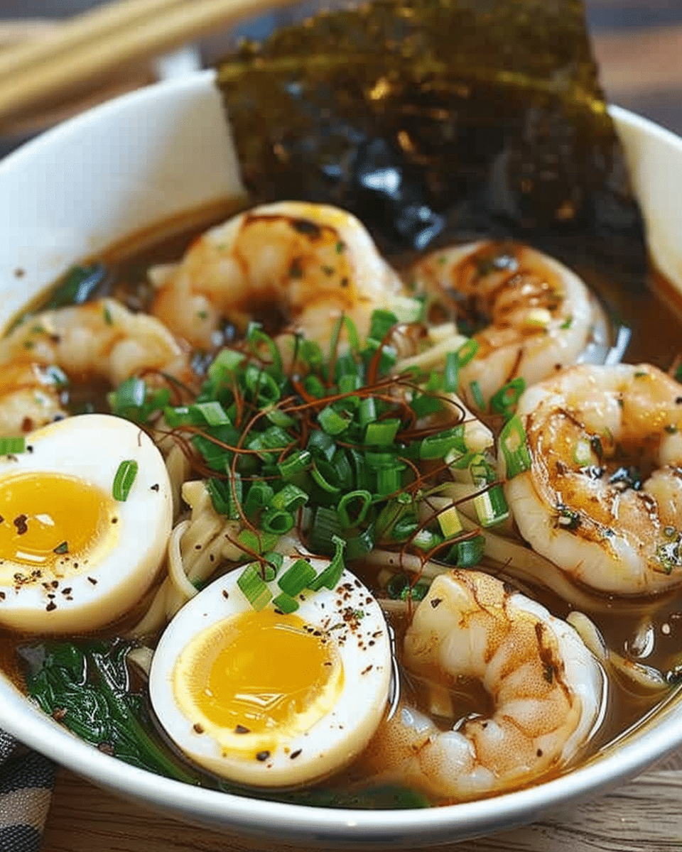 A cozy, flavor-packed bowl of shrimp ramen made with aromatic broth, tender noodles, and perfectly cooked soft-boiled eggs. This comforting soup comes together quickly yet delivers deep, satisfying flavor.